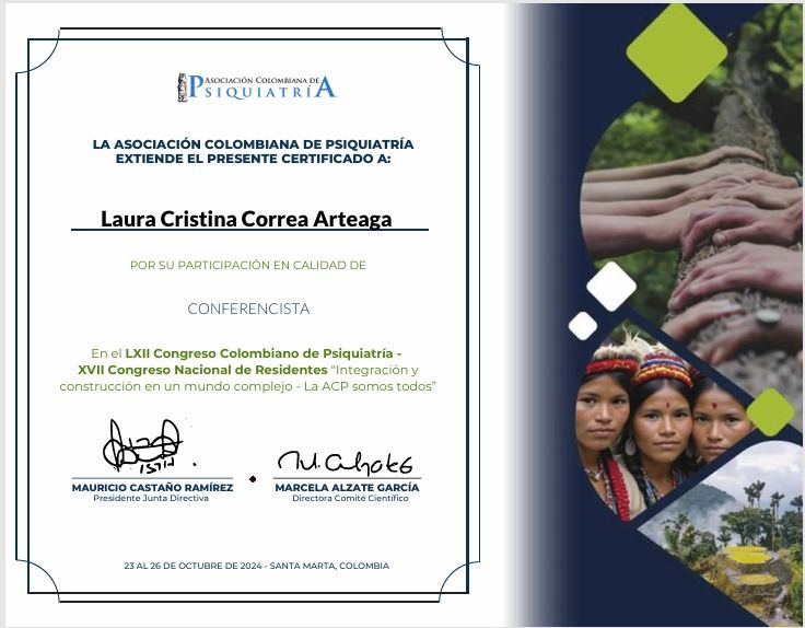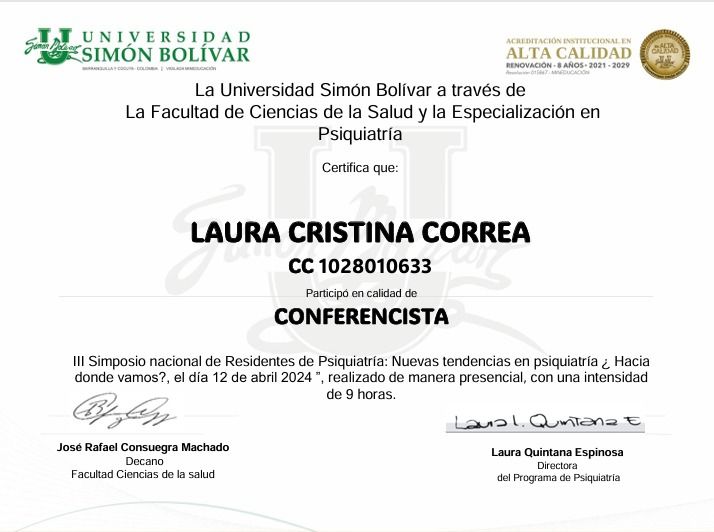 Soy la Dra. Laura Correa Arteaga, especialista en Psiquiatría graduada en la Universidad Simón Bolivar de Colombia.